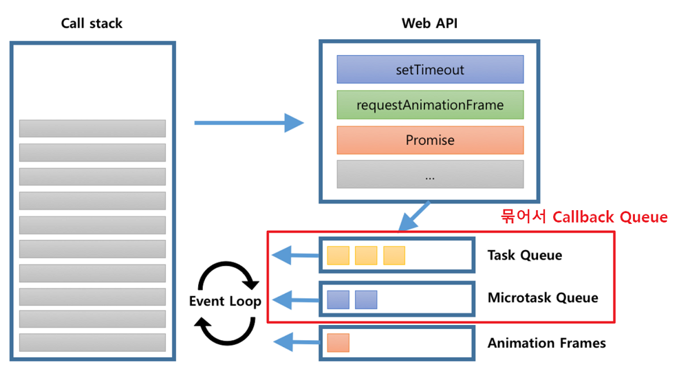 ์ด ์๋ฃ๋๋ฉด ์คํ๋๋ ํจ์๋ค์ด ๋๊ธฐํ๋ ๊ณต๊ฐ (Call Stack์ด ๋น์ด์์ ๋ Micro, Macro ์์ผ๋ก Queue์ ์๋ ์ฝ๋ฐฑ ํจ์๋ค์ Call Stack์ผ๋ก ์ฎ๊ธฐ๊ฒ ๋จ)